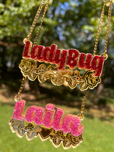 NECKLACE IS NICKEL-FREE GOLD PLATED. NAMEPLATE IS MADE OUT OF ACRYLIC. IF YOU TAKE CARE OF THEM THEY WILL LAST FOR A LONG TIME.